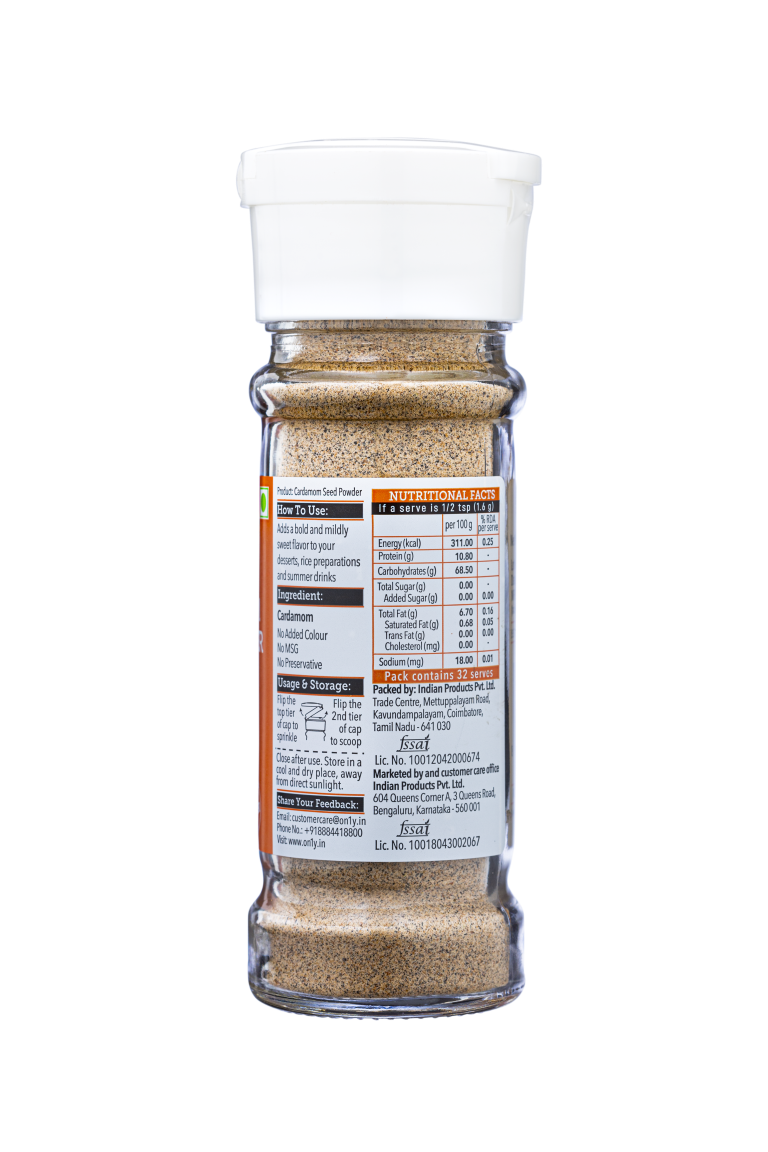 Boldly aromatic when used in teas and desserts, cardamom adds a lavish and rich flavour to your dish. With a strong, unique taste and an intensely aromatic, resinous fragrance, cardamom powder has a mild fruity finish to it.