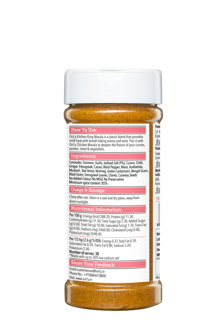 Experience the rich flavours of your favourite dishes with On1y Low Sodium Kitchen King Masala. This versatile blend is perfect for curries, stews, and more. With a thoughtful balance of spices and reduced sodium, it’s the essential choice for healthy, hearty cooking.