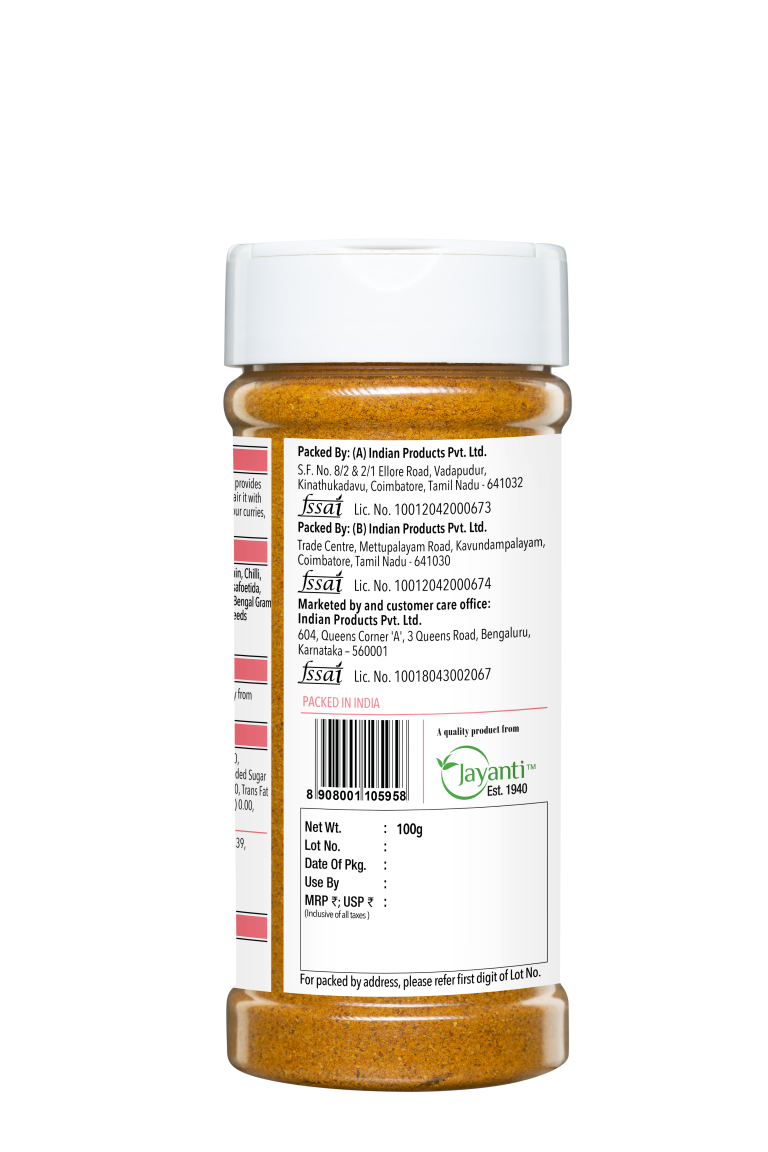 Coriander, Turmeric, Garlic, Low Sodium Iodised Salt (9%), Cumin, Chilli, Ginger, Fenugreek Leaves, Cassia, Black Pepper, Mace, Asafoetida, Mustard , Star Anise, Nutmeg, Green Cardamom, Bengall Gram, Black Gram, Methi leaves, Cloves, Caraway Seeds