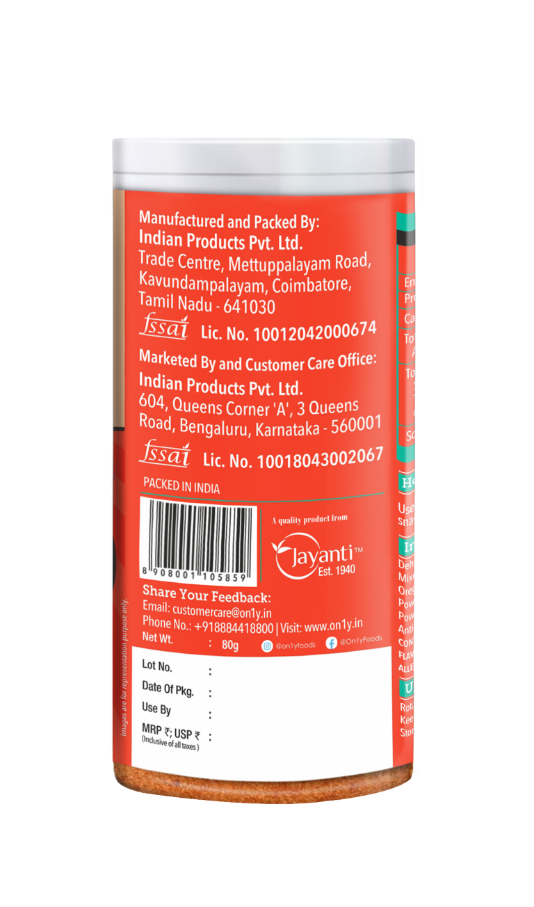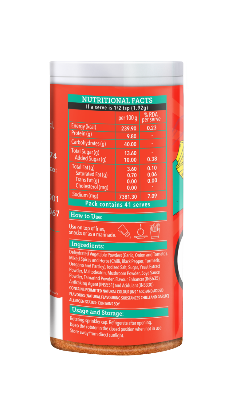 Dehydrated Vegetable Powders (Garlic, Onion and Tomato), Mixed Spices and Herbs (Chilli, Black Pepper, Turmeric, Oregano and Parsley), lodized Salt, Sugar, Yeast Extract Powder, Maltodextrin, Mushroom Powder, Soya Sauce Powder, Tamarind Powder, Flavour Enhancer (INS635), Anticaking Agent (INS551) and Acidulant (INS330). CONTAINS PERMITTED NATURAL COLOUR (INS 160C) AND ADDED FLAVOURS (NATURAL FLAVOURING SUBSTANCES CHILLI AND GARLIC) ALLERGEN STATUS: CONTAINS SOY