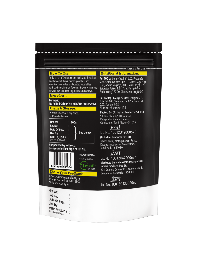 On1y’s Turmeric Powder boasts premium, carefully sourced ingredients that bring authentic and vibrant flavors to your kitchen. With high potency, On1y Turmeric Powder can be used in all your Indian dishes but also ideal for immunity boost when consumed with milk.