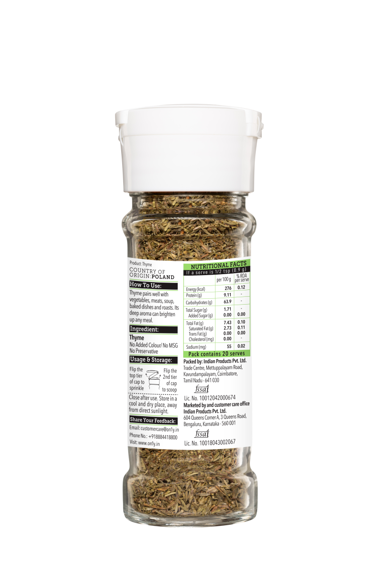 Thyme is known to go well with most herbs. Warm and pungent flavoured, it makes an exciting companion for every dish. Mediterranean, Italian and French cuisines reach a whole new delicious level with a dash of thyme.